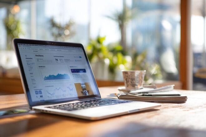 Un espace de travail serein avec un ordinateur portable ouvert sur un site web financier