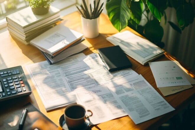 Image d'illustration. Vue aérienne d un espace de travail avec documents fiscaux et livres financiersADN
